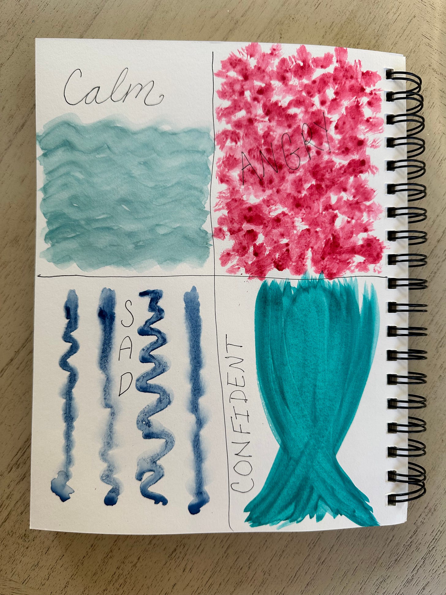 Close your eyes, breathe deeply, and remember a time when you felt “emotion”. What color comes to mind? Pick up that color and begin filling the space on your paper with lines and movements that express how you experience that emotion.